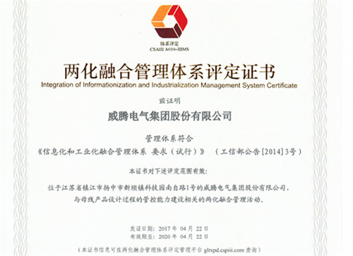 2015年11月,尊龙凯时建设两化融合治理向导小组,2016年11月最先着手认证事情,经由相关部分的通力相助和一直起劲,通过第三方审核认证,并获得国家工信部的认可,成为我市第二家通过两化融合治理系统认证的企业。